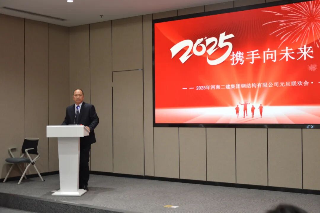 2024年12月31日下午,我公司在河南二建产业园区办公楼一楼多功能厅举办“2025,携手向未来”庆元旦茶话会,河南二建集团副总经理、河南二建钢结构公司总经理张永庆与公司员工齐聚一堂,共同喜迎新年。