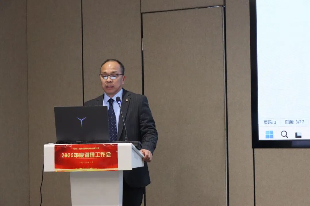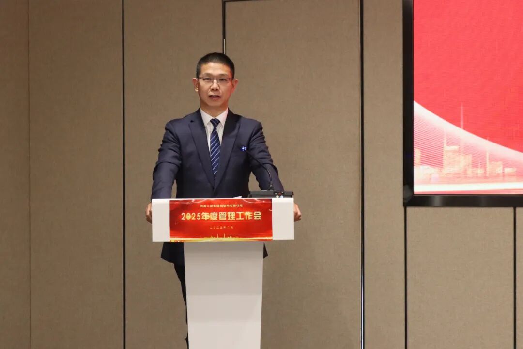 河南二建集团公司副总经理、河南二建集团钢结构公司总经理张永庆作《河南二建集团钢结构有限公司二〇二五年度管理工作报告》,详尽阐述了我公司在2024年度于国内市场深耕、海外市场拓展、企业管理提升、技术创新平台建设、人才培养成果及社会责任践行等主要工作重点和亮点,同时指出了在品牌建设、海外管理、风险防控、市场开拓、成本管控及融资等方面的不足,明确了2025年度工作目标和工作安排。河南二建集团钢结构公司总经理助理罗凯作《河南二建集团钢结构有限公司2025年度海外工作报告》。