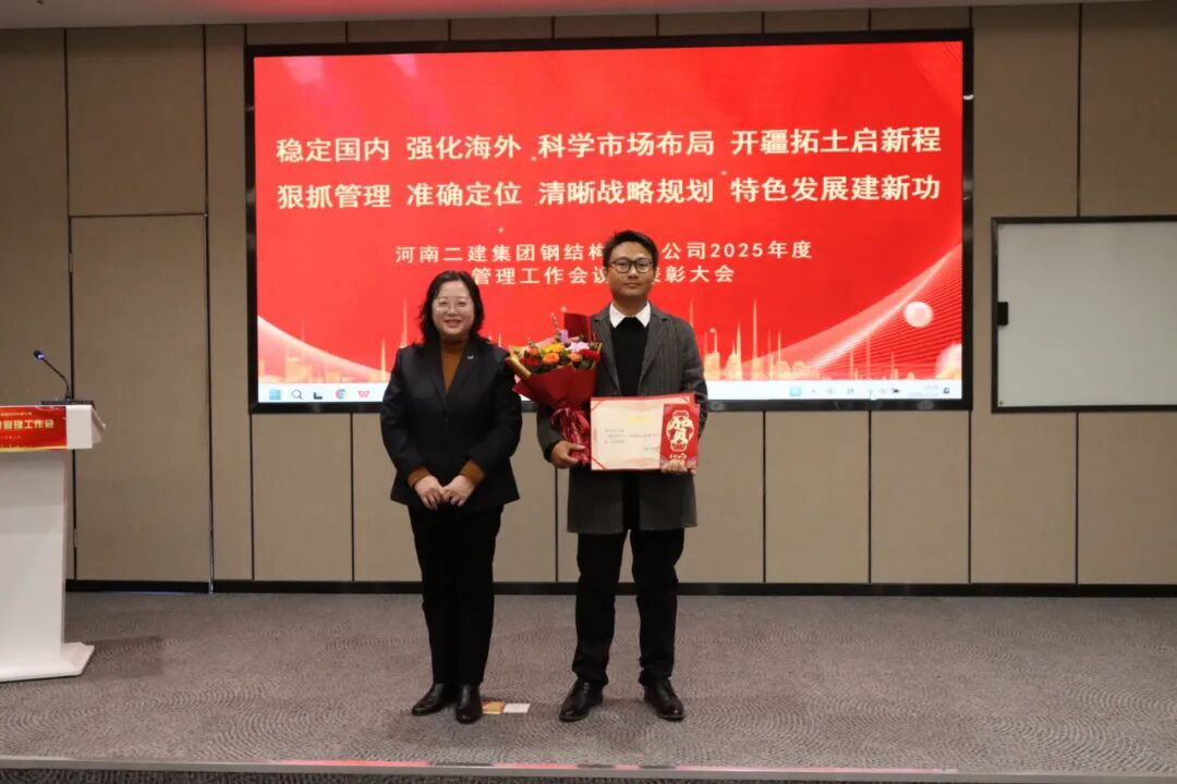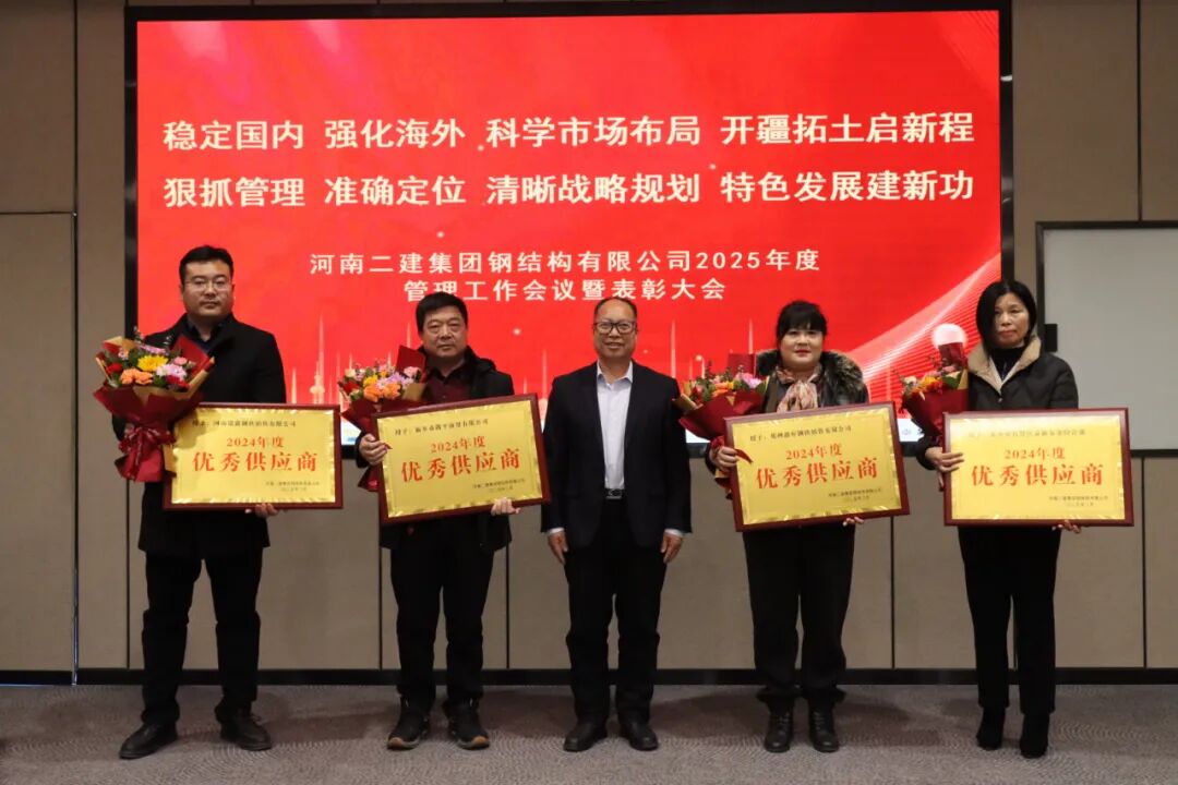 2月14日上午,我公司2025年度管理工作会暨表彰大会在建筑产业园一楼多功能厅召开,会议主题为“稳定国内、强化海外、科学市场布局,开疆拓土启新程;狠抓管理、准确定位、清晰战略规划,特色发展建新功”。河南二建集团董事长祝建明,副董事长、河南二建集团钢结构公司董事长王庆伟,河南二建集团副总经理陈建中、财务总监张浩敏,党委副书记、工会主席贾向军出席会议。河南二建集团钢结构公司机关部门副职以上人员、项目(执行)经理、先进代表以及优秀合作方代表共80余人参加会议。会议由河南二建集团副总经济师、河南二建集团钢结构公司副总经理樊慧斌主持。